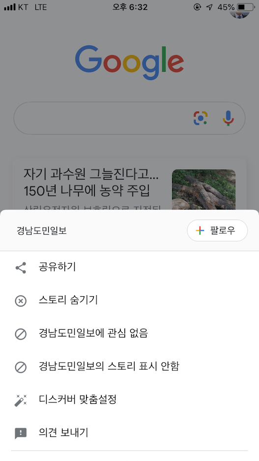 더 훌륭한 것은 위치기반 노출을 해준다는 겁니다. 즉 사용자가 경상남도에서 접속했다면 경남지역 언론에서 생산된 뉴스를 중간중간 보여줍니다. 물론 이 또한 사용자가 해당 매체의 뉴스가 보기 싫다면 '○○일보에 관심 없음' 또는 '○○일보의 스토리 표시 안함'에 체크할 수 있습니다.