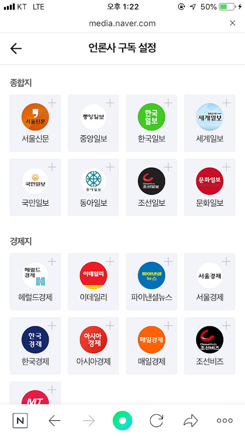 그러나 네이버 앱에 들어가면 다릅니다. 미리 네이버가 선별한 44개 언론사 중에서만 선택하도록 합니다. 죄다 서울 언론입니다. 서울 이외 지역언론은 아예 선택지에 없습니다. 주간지는 말할 것도 없고요.