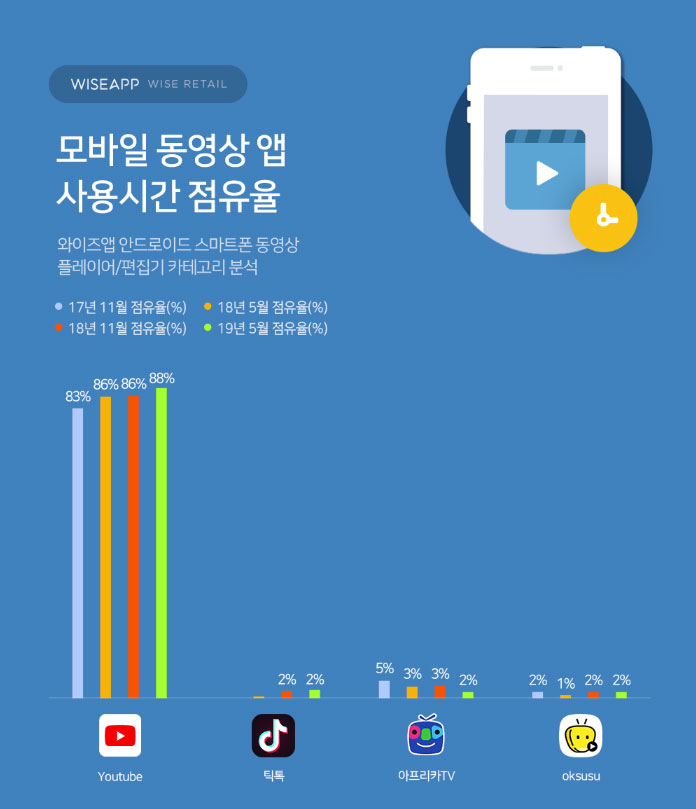 전체 앱이 아닌 동영상 앱만으로 비교하면 그 차이는 훨씬 놀랍습니다. 2019년 5월 와이즈앱이 발표한 모바일 동영상 앱 점유율은 유튜브가 88%, 틱톡이 2.4%, 아프리카TV와 옥수수가 각 1.9%였고, 네이버TV는 아예 순위에도 잡히지 않았습니다. 2018년 5월 유튜브가 85.6%일 때 네이버TV가 2%였었는데, 1년 사이 네이버TV는 존재감조차 사라져 버린 겁니다.