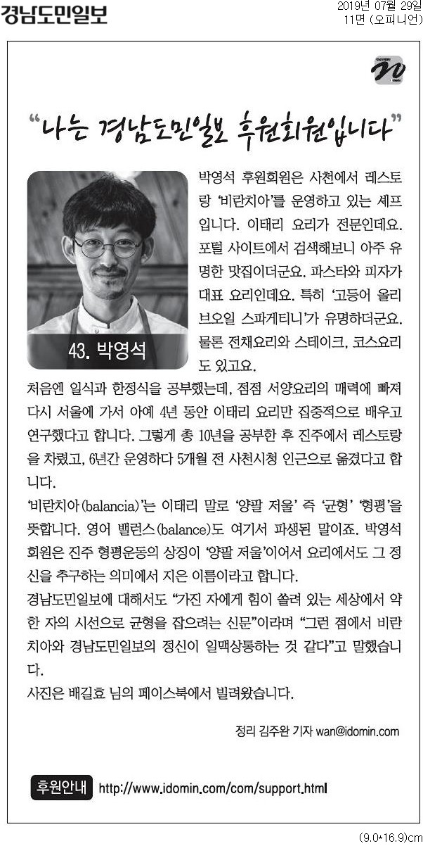 박영석 후원회원은 사천에서 레스토랑 ‘비란치아’를 운영하고 있는 셰프입니다. 이태리 요리가 전문인데요. 포털 사이트에서 검색해보니 아주 유명한 맛집이더군요. 파스타와 피자가 대표 요리인데요. 특히 ‘고등어 올리브오일 스파게티니’가 유명하더군요. 물론 전채요리와 스테이크, 코스요리도 있고요.