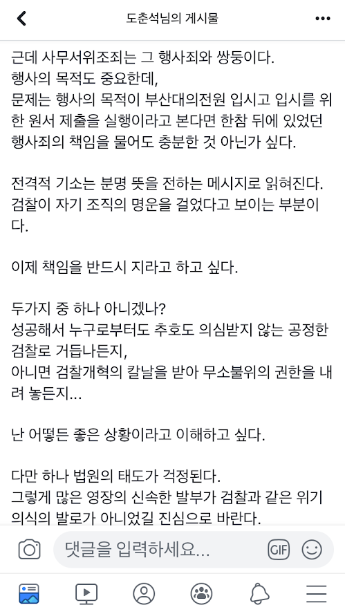 검찰이 조국 법무부장관 후보자 인사청문회 직후 그의 부인 정경심 교수를 전격 기소한데 대해 도춘석 변호사가 페이스북에 이런 글을 남겼다.