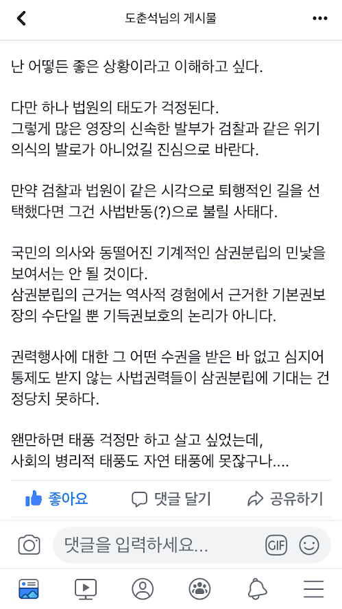 도춘석 변호사는 같은 글에서 수많은 압수수색 영장을 신속히 발부한 법원 판사들의 의도에 대해서도 우려의 목소리를 냈다.