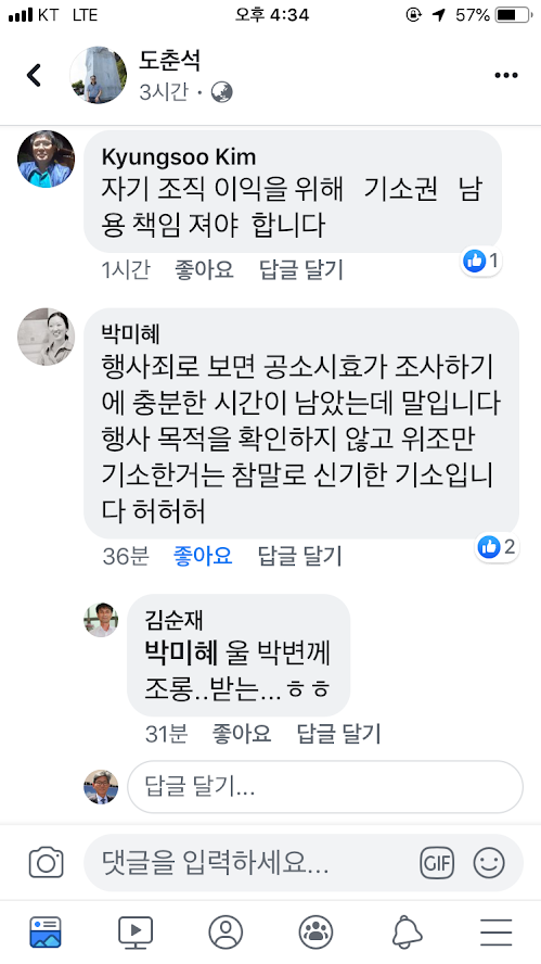이 글에 대해 박미혜 변호사도 댓글을 통해 검찰의 기소에 무리수가 있음을 지적했다.