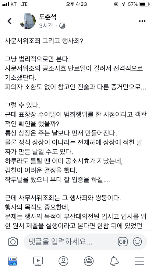 도 변호사의 글을 찬찬히 읽어보면 검찰의 무리수가 느껴진다. 쉽게 말하자면, 설사 정경심 교수가 사문서위조를 했다 하더라도, 상장에 표시된 날짜보다 하루라도 먼저 위조를 했다면 이미 공소시효는 끝난 셈이 된다는 게 하나요, 2년 후 그 위조된 상장으로 부산대의전원에 합격한 것이라면 아직 공소시효가 2년이나 남아있는 셈이라는 게 또 하나의 사실이라는 것이다.