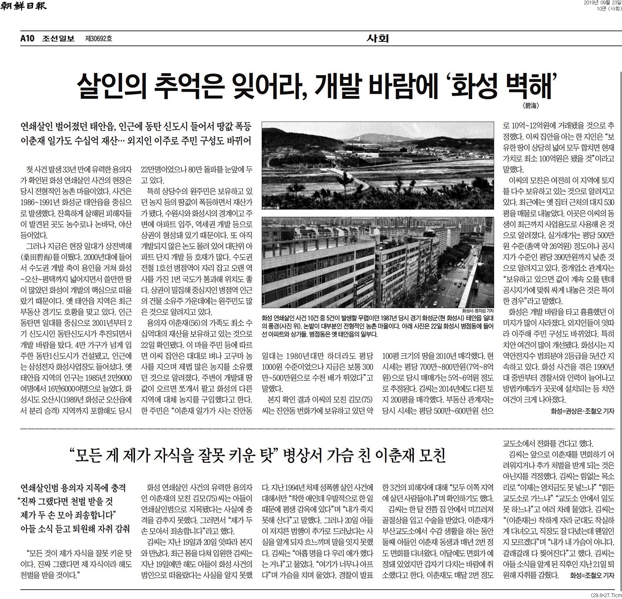 연쇄살인사건이 일어났던 화성시가 도시로 개발되면서 땅값이 크게 올랐고, 그 덕분에 '대대로 벼나 고구마 농사를 지으며 제법 많은 농지를 소유했던' 이 사건 용의자 이춘재의 모친(75세)도 '최소 수십억 원대의 재산을 보유하고 있는 것으로 확인됐다'는 내용이었습니다. 2010년에 100평 크기의 땅을 매각했고, 2014년에도 다른 토지 200평을 매각했으니 당시 시세로 얼마라는 식의 기사였습니다.