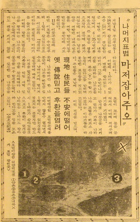 "6·25동란 이후 자취를 감추었던 표범이 지난 4일 아침 8시경 경남 함안군 영암산 중턱에서 잡혀 화제가 되고 있다. 부산 부민동1가 18번지에 사는 설욱종(50) 씨가 동료 2명과 함께 사냥갔다가 엽총으로 쏘아잡은 이 표범은 무게 49kg 길이 1m85cm의 15살짜리로 경남에서 잡히기는 처음이다. 사냥을 시작한 지 20년 간에 표범을 잡은 설씨는 박제로 만들어 영구히 가보로 보존할 것이라고 한다."