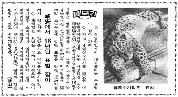 "경남 함안에서 18세쯤 되는 수표범이 잡혀 화제. 지난 4일 상오 10시쯤 함안군 여항면 내곡리 뒷산에 노루 사냥갔던 설욱종씨(50·부산시 서구 부민동1가 18) 등 3명은 범의 발자국을 따라 내곡리 마을에서 약 4km 떨어진 산 속(해발 700m)에 이르렀을 때 50m 앞 소나무숲에 있던 표범을 발견, 15m 지점까지 접근하여 단발총으로 머리를 명중시킨 것. 총에 맞은 표범은 2m나 치솟으며 산이 떠나갈 듯 소리치다가 일제 사격을 받아 끝내 쓰러진 것인데 이 표범은 머리에서 꼬리까지의 길이가 1m60cm 무게 51.5kg(14관). 갈색과 검은 반점이 있고 시가 70만 원쯤."