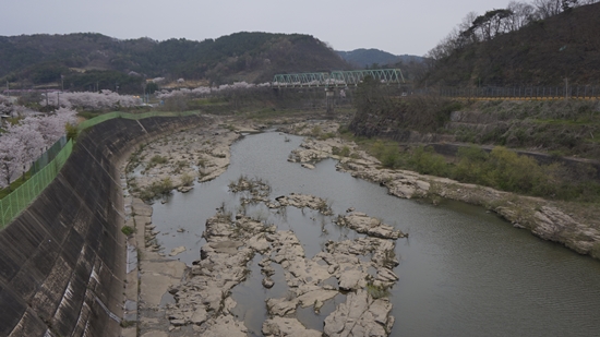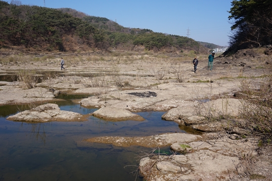 남강댐 방수로 공사는 뜻하지 않게 선물도 하나 안겨주었다. 1997년 천연기념물 제390호로 지정된 ‘진주 유수리 백악기 화석 산지’이다. 1억년 전 지층으로 너비는 150m이고 길이는 2㎞이다. 방수로를 내려고 고갯마루를 깎는 바람에 그 아래 화석 지층이 드러난 것이다.