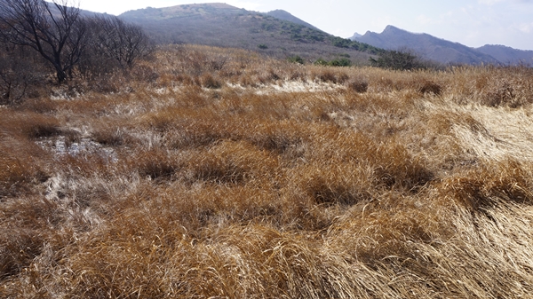 단조늪은 길이가 영축산 마루에서 단조봉까지 1100m 남짓이고 너비는 마루금에서 서쪽으로 300~500m 정도 된다. 우리나라 고산습지 가운데 규모가 가장 크다고 한다. 특별하게 물이 날 것 같지 않은 지세인데도 바닥이 언제나 젖어 있다. 영축산 정상 바로 아래에서 억새평원을 보면 습지가 단박에 구분된다. 여름에는 주변보다 좀 더 보드라운 풀이 우묵하게 자라나 있기 때문이고 가을에는 그 풀들이 발목께에서 자빠진 채로 이리저리 널브러져 있기 때문이다. 자빠진 방향은 대체로 물이 흘러내리는 아래쪽이지만 때로는 산마루 쪽으로 거슬러오르는 축도 적지 않다. 겉으로 보면 억새 일색이지만 억새 아래쪽에는 진퍼리새처럼 키가 작은 풀들이 촘촘하다. 가만 헤아려보니 이런 자리가 최소 일곱 군데였다.