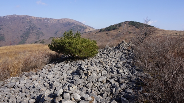 단조봉에서 영축산 산마루 동쪽 아래 300m 즈음에 이르기까지 성터를 따라 걸었다. 마지막 끝나는 자리에는 자연 암석 위에 반듯하게 쌓은 석성 모양이 10m 정도 보였다. 하지만 나머지는 돌들이 모두 되는 대로 대중없이 겹쳐져 있었다. 처음부터 이랬는지 아니면 원래는 반듯하게 쌓았지만 나중에 허물어져 이렇게 되었는지는 짐작하기 어려웠다. 네모 또는 동그라미 모양으로 안쪽 움푹하도록 해서 사람 무릎 높이 정도까지 돌을 포개어 쌓은 데도 스무 군데 정도 있었다. 움푹한 안쪽이 너른 경우는 사람이 네댓 들어갈 만큼 되었다. 1948~1953년 일대에서 빨치산이 활동했다니까 그들이 묵었던 자리일까 싶었지만 그냥 짐작일 뿐이다. 이밖에 서너 군데 기둥 모양으로 3~4m 쌓아올려져 있었는데 쓰임새를 짐작하기는 어려웠다. <영남 알프스 오디세이>에 나오는대로 임진왜란 당시 의병들이 썼던 망루(望樓)나 봉수대일까?