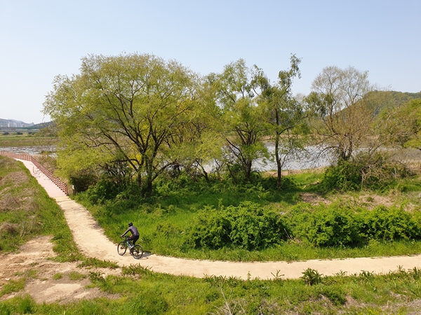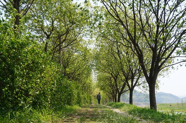 오른쪽 길은 잘 자란 나무들이 줄지어 맞는다. 바람이 물과 나뭇잎을 푸르게 연결해준다. 멈추고 돌아보면 여태 살아온 나날처럼 길이 아득하다. 넉넉한 그늘 따라 천천히 걸어도 1시간이면 족하다.