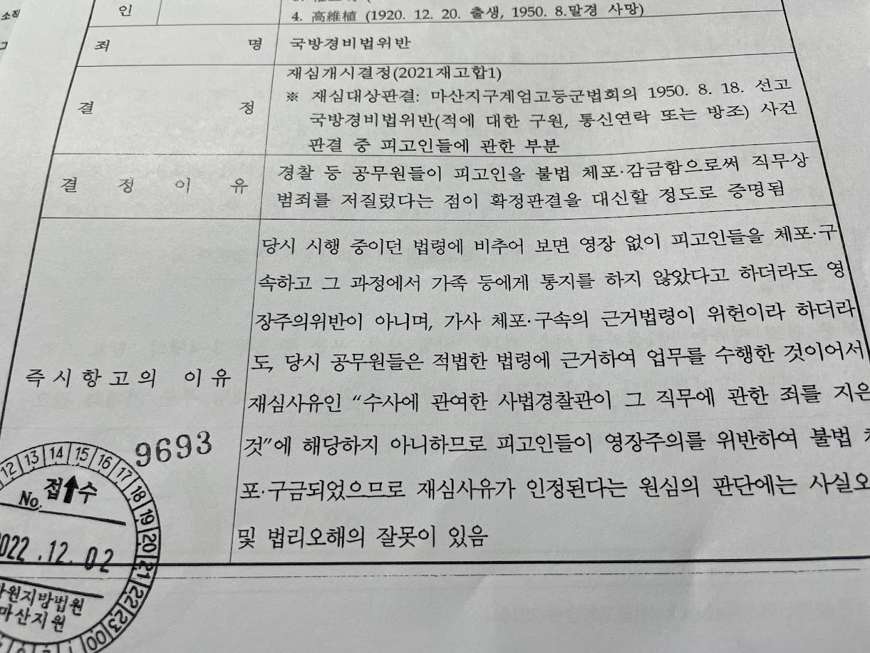 이와 똑같은 사건에 대해 대한민국 진실화해를 위한 과거사정리위원회는 불법 학살이라는 진실규명 결정을 했고, 대한민국 사법부 역시 재심을 통해 국방경비법 위반죄를 무죄로 판결한 바 있다. 그게 불과 2년 전인 2020년의 일이다. 당시 대법원은 형사 재심 개시 결정을 내렸고, 검찰은 이들 희생자에게 무죄를 구형했다. 재판부 역시 당연히 무죄를 선고했다.