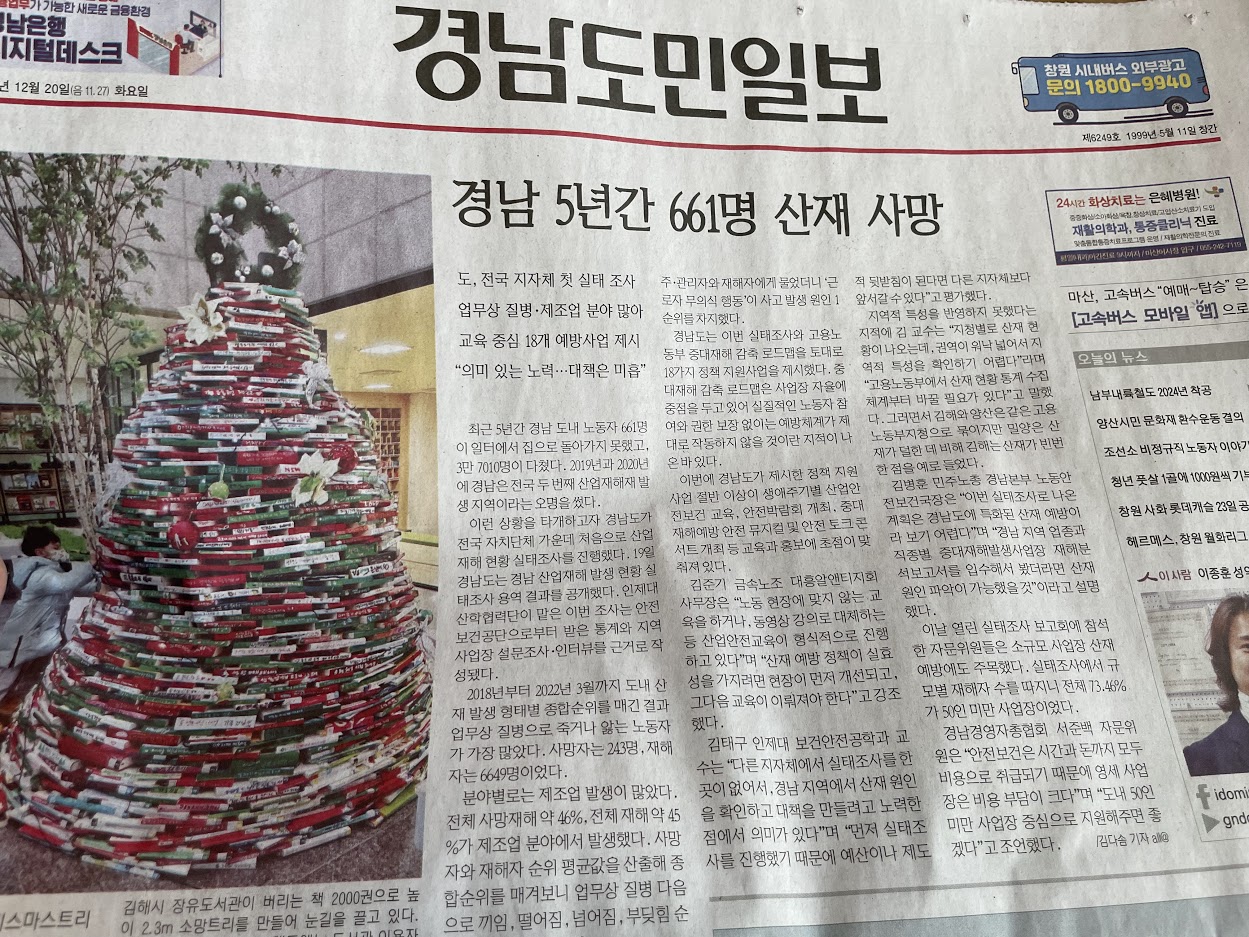 오늘자 경남도민일보 1면에 경남 산업재해 사망자 숫자가 나왔다. 지난 5년간 경남에서 661명이 산업재해로 목숨을 잃었고, 3만 7010명이 다쳤다고 한다.
